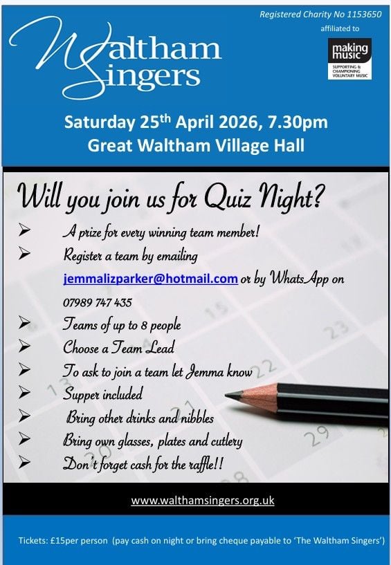 Our next concert will be on Saturday 20th June 2026 at 7.30pm at Great Waltham Church. This will be a concert of mixed music suitable for a summer evening. Details and tickets coming soon.