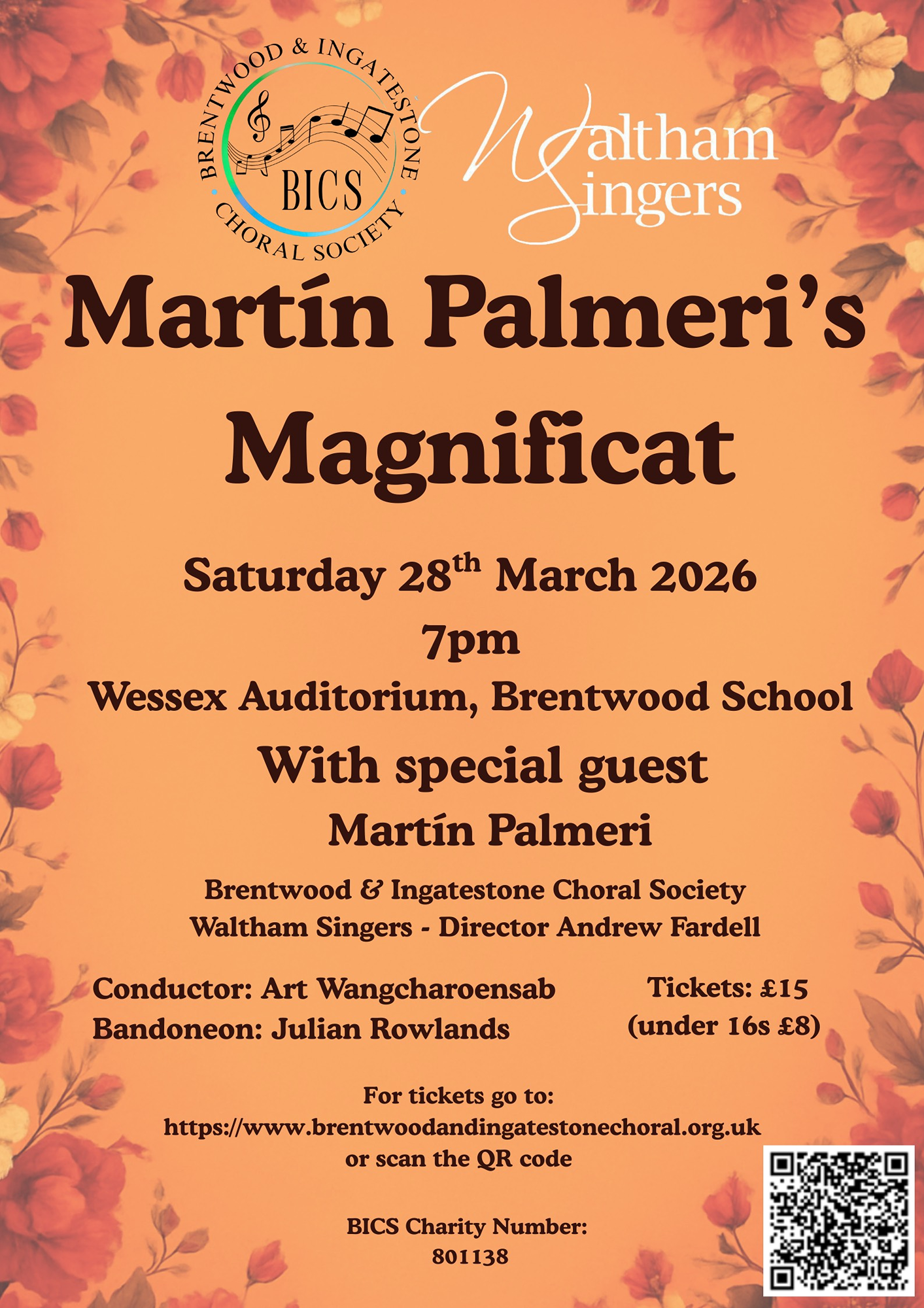 Our next concert will be on Saturday 28th March 2026 at 7.30pm at Brentwood School. We are delighted to be joining for a return performance with the Brentwood and Ingatestone Choral Society. An exciting programme featuring choral works by Argentian composer Martin Palmeri is planned, with Palmeri himself playing for the performance. Details and tickets coming soon.